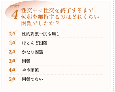 score4 性交中に性交を終了するまで勃起を維持するのは どれくらい困難でしたか?